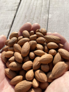 お昼休憩がおわって外を見ると、アーモンド畑に雪が少し